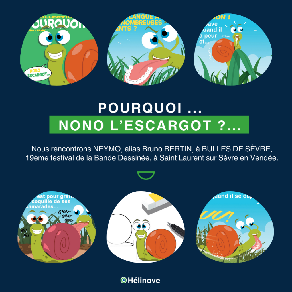 En mars 2025, HÉLINOVE rencontre NEYMO, à BULLES DE SÈVRE, au 19ème festival de la Bande Dessinée, à Saint Laurent sur Sèvre en Vendée. Sur mon idée et mes conseils, un nouveau livret enrichit la « collection Pourquoi ». Il dévoile NONO L’ESCARGOT, et il pose des questions aux tout petits.