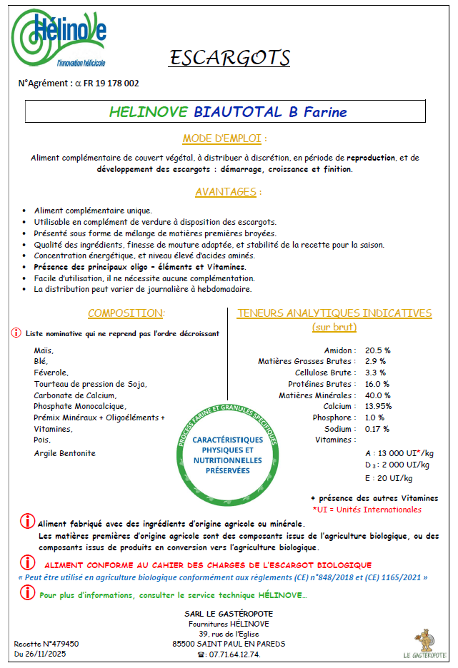 Aliment complémentaire de couvert végétal, à distribuer à discrétion, en période de développement des escargots: démarrage, croissance et finition.