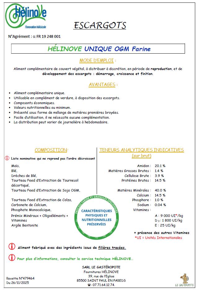 HELINOVE UNIQUE OGM farine Big bag 1000 Kg
